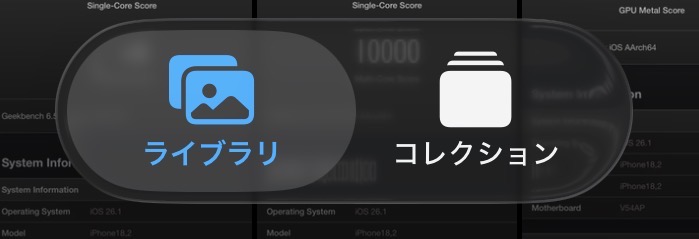 見当たらない理由は、iPhoneの写真アプリのモードが「ライブラリ」になっているからです。「ライブラリ」モードだと写真が時系列に並ぶため、人から共有された写真が少し古い日時のものだと過去日時の場所に埋もれてしまうのです。